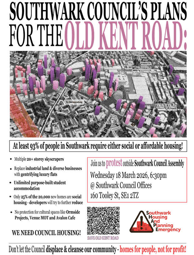 SHAPE and Southwark Defend Council Housing are organising a number of actions to protest against the Old Kent Road Area Action Plan (AAP), which proposes major development of the area to build 20,000 new homes, of which only 5,000 will be social rented, and an unspecified number to be council homes.
